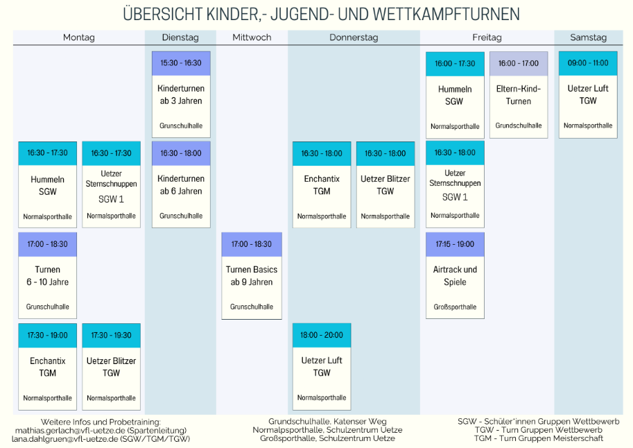 Melde dich gerne für ein Probetraining bei unserer Spartenleitung unter mathias.gerlach@vfl-uetze.de oder für die Wettkampfgruppen bei lana.dahlgruen@vfl-uetze.de.